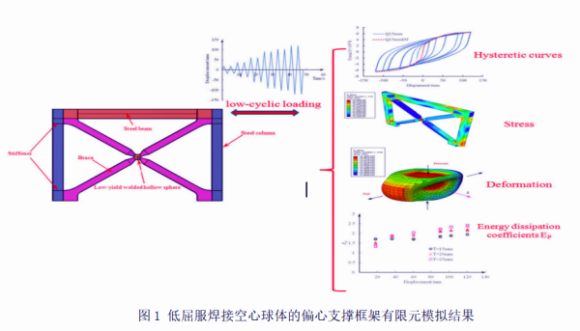有研究者(案例1)通过热弹-塑性有限元法对GH3030单筒排气管TIG焊接过程进行模拟、验证,并对排气管的两道焊缝设计六种焊接工序进行优化研究,以控制焊接残余应力及焊后变形。结果表明:单筒排气管采用先长后短的焊接顺序和焊接方向相反的工艺方案,其焊接应力更小,焊后变形改善效果显著。如图1(案例2)利用ABAQUS对采用低屈服焊接空心球体的偏心支撑框架在单调及低循环载荷下的力学性能进行了数值分析表明,该结构具有良好的抗震与耗能性能,变形主要集中在框架柱底部、焊接空心球体及梁端薄弱区域。焊接空心球体的壁厚对结构性能影响显著,壁厚增大会提高承载力、刚度和耗能能力,但降低球体变形能力。等效塑性应变分析显示,焊接空心球体与支撑件连接处是结构最易发生断裂的位置。