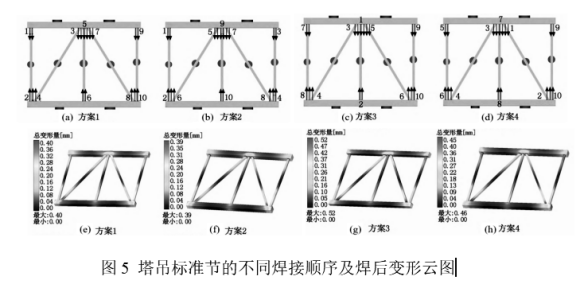 案例9研究了塔吊标准节焊后变形问题,建立了主弦杆与腹杆三维模型,利用Simufact Welding模拟焊接温度场和工艺过程,分析了变形分布规律。结果表明,焊接区温度迅速升高引起材料热膨胀和变形,影响装配精度。通过降低焊接速度和优化焊接顺序,可有效减小焊缝变形,提升焊接质量与装配精度。