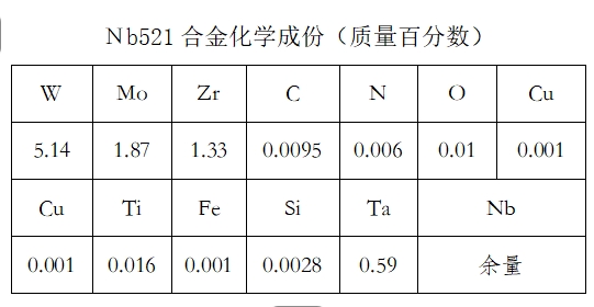 Nb521是近年来我国开发的新一代高温材料,是在铌基体中添加一定比例的钨元素以及其他合金化元素形成的铌合金,其中包括Mo、Zr合金化元素及少量的C元素,钨和铌形成无限固溶体,既保持了铌优良的低温塑性,又显著提升了合金的强度、硬度及韧性。Nb521具有优异的高温性能,在室温下抗拉强度在500MPa左右,800℃下强度超过320MPa,1600℃下使用时的抗拉强度仍超过100MPa。Nb521的化学成分如下表。