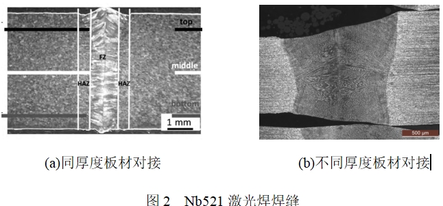 由于激光焊不受真空条件限制,又具备电子束焊接一样的高能密度特性,在焊接过程中体现出很好的灵活性。已研究发现Nb521合金有良好的焊接性:对4.6 mm厚的Nb521板材进行激光焊,优化工艺焊接得到的焊缝表面成形质量好,接头常温抗拉强度与母材相当;对1 mm厚的Nb521板材激光对接焊也表明,在合适的热输入条件下,可以获得优质焊接接头。